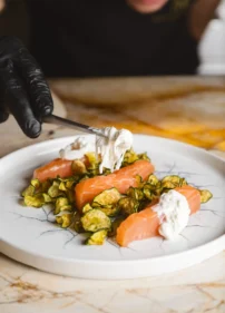 La cucina di Morus si basa su una selezione attenta della materia prima, con particolare attenzione al pesce fresco e alla stagionalità.
