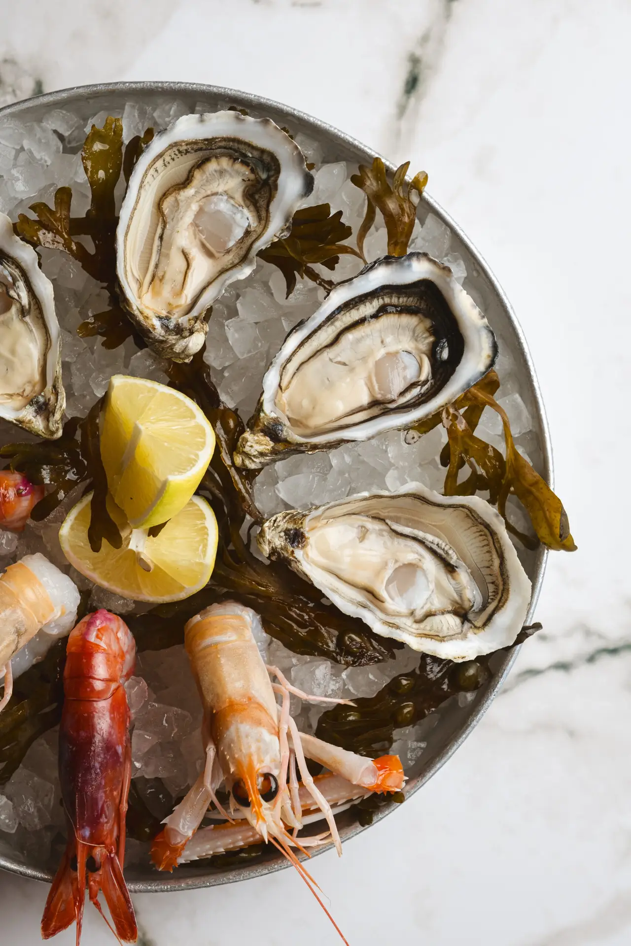 2 gamberi rossi, 2 scampi, 2 allievi, 2 ostriche del giorno, 2 ostriche Gillardeau